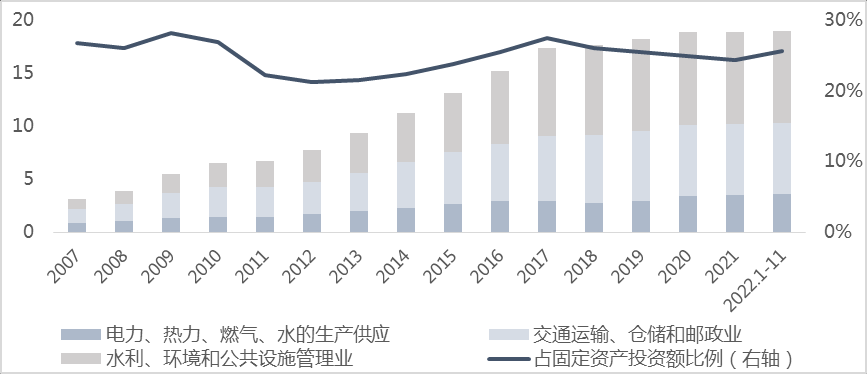 根據(jù)WIND數(shù)據(jù),廣義基建投資2021年達(dá)到18.9萬億元,占全社會固定資產(chǎn)投資額的24%,具體分為三大類行業(yè),一是交通運(yùn)輸、倉儲和郵政業(yè),占2021年基建投資的36%,主要有道路運(yùn)輸業(yè)(包括城市軌交,不含市政道路)、鐵路運(yùn)輸業(yè)、倉儲業(yè)等;二是水利、環(huán)境和公共設(shè)施管理業(yè),占2021年基建投資的46%,主要有公共設(shè)施管理業(yè)(包括城市道路、排水、橋梁、廣場、公園等市政工程和城市公共設(shè)施)、水利管理業(yè)、生態(tài)保護(hù)和環(huán)境治理業(yè)等;三是電力、熱力、燃?xì)饧八纳a(chǎn)和供應(yīng)業(yè),占2021年基建投資的18%。