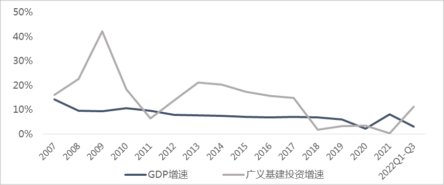 其次,基建投資是我國實(shí)施宏觀調(diào)控的重要抓手。基建投資可控性強(qiáng),可在預(yù)期時(shí)間內(nèi)促進(jìn)經(jīng)濟(jì)企穩(wěn)、穩(wěn)定民生就業(yè)、改善市場預(yù)期,是良好的逆周期政策調(diào)節(jié)工具。千禧年以來的經(jīng)濟(jì)下行期中,基建投資均起到了熨平周期、穩(wěn)定增長的作用。第一次是2008-2009年,面對全球金融危機(jī),我國推出“四萬億”等財(cái)政政策,基建投資同比增速大幅提高至23%、42%,占2009年GDP比例達(dá)12.8%,強(qiáng)勢托底經(jīng)濟(jì);第二次是2012-2013年,面對歐債危機(jī)等外生沖擊,基建投資增速在2013年大幅回升至21%,疊加制造業(yè)、房地產(chǎn)一同刺激經(jīng)濟(jì)復(fù)蘇;第三次是2016年,面對經(jīng)濟(jì)下行,基建投資在相對寬松的政策環(huán)境下維持高位,以15.71%的增速穩(wěn)住經(jīng)濟(jì)大盤;第四次是2022年前三季度,我國經(jīng)濟(jì)增速受疫情沖擊下滑至3%,基建投資再度扛起穩(wěn)增長大旗,同比增速達(dá)到11.2%,有力帶動經(jīng)濟(jì)回歸正常軌道、確保運(yùn)行在合理區(qū)間。